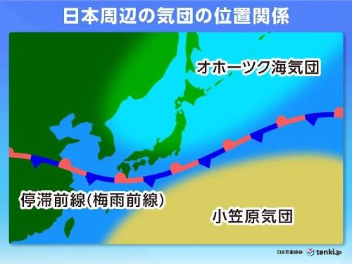 梅雨前線には、「太平洋高気圧(小笠原気団)」と「オホーツク海高気圧(オホーツク海気団)」の2つの気団が関係しています。