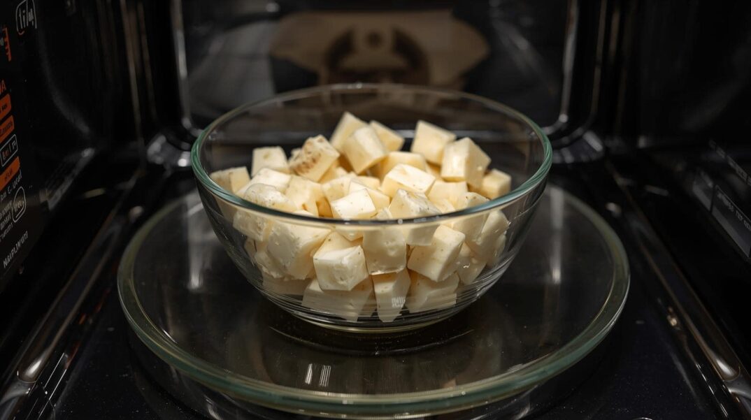 • 耐熱容器に里芋いれて半分ほど水に浸し、電子レンジでラップをかけずに600Wで約3分加熱した後、上下を返して2分ほど加熱する。