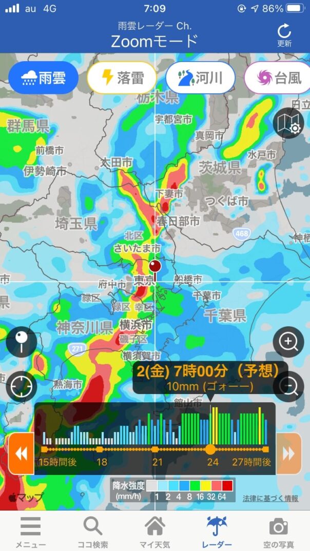 ゲリラ豪雨だけでなく雨全般の予測を一目で確認できるため、洗濯物を取り込みタイミングや出かける時間帯を決める心強いツールです。