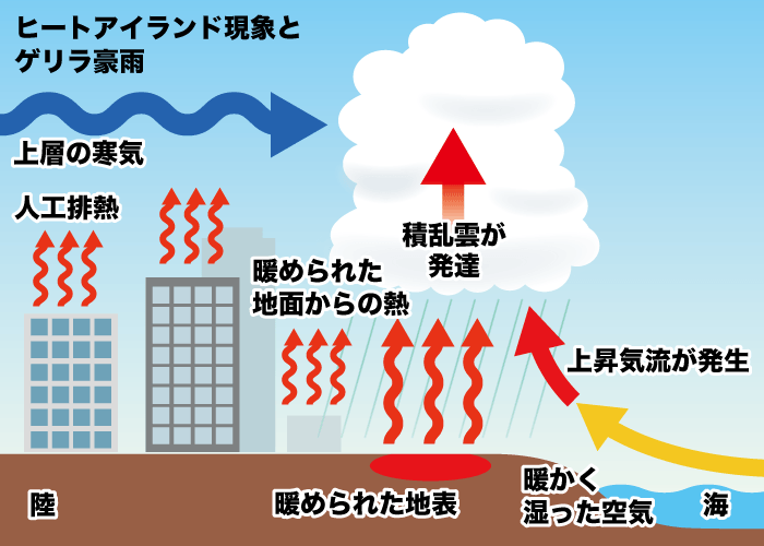 - 夏の強い日差しやヒートアイランド現象(都市部がビル・アスファルト・自動車などの排気ガスの集中により、周囲の郊外よりも高温になる現象)によって、地表面近くの空気の温度が上がる。
