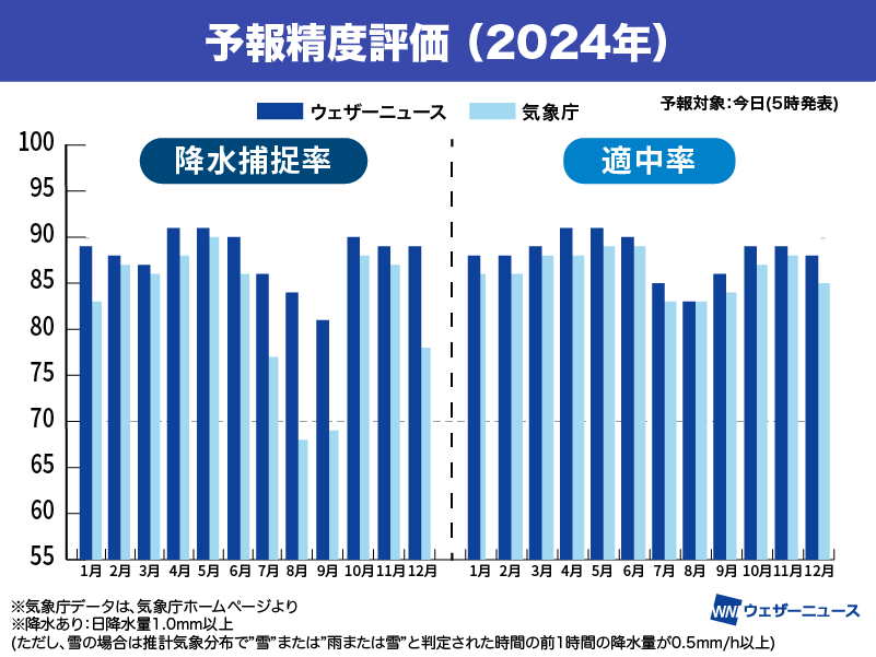 予測の精度を表す下記の2つの指標において、ウェザーニュースの予測精度は気象庁を上回りました。